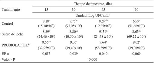 Además de la reducción en la proteólisis, en este trabajo se observó que la adición de PROBIOLACTIL® debió aumentar la población de BAL en los ensilajes elaborados. En la tabla 5 se muestra la concentración de este género microbiano, según el tratamiento y el tiempo de muestreo. A los 15 días, los ensilajes no presentaron diferencias entre sí. En el tiempo 30, el tratamiento con PROBIOLACTIL® mostró cifras superiores con respecto al control, pero no con relación a los ensilajes inoculados con suero de leche, que tampoco difirieron del control. A los 45 días no hubo diferencias entre ellos, pero sí a los 60, en los tratamientos inoculados y en el control, que presentó los valores más bajos de la evaluación.