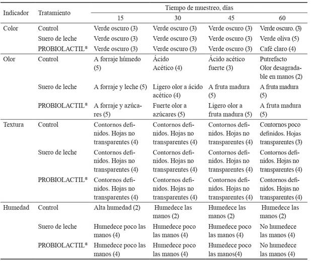 La caracterización del color de los ensilajes, provenientes de forrajes presecados, se debe valorar con moderación porque los pigmentos originales cambian su tonalidad por las oxidaciones que ocurren durante el proceso de deshidratación (Kung et al., 2018). Estas transformaciones se observaron durante el pretratamiento realizado con el forraje que se utilizó en la investigación e indujo a que no se encontraran contrastes entre los tratamientos, excepto a los 60 días, en los que fueron inoculados. Estos mejoraron las puntuaciones por coloración, al cambiar a tonos menos intensos.