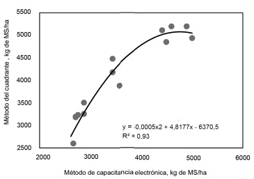 En este estudio, los resultados mediante las regresiones (lineal y polinómica) indicaron que la disponibilidad de MS kg/ha entre el método del cuadrante y la capacitancia electrónica con equipo mostró una correlación positiva, con un coeficiente de determinación de R2 = 0,87. Esto indica que 87 % de la variabilidad de los datos obtenidos entre los métodos se explica (fig. 2).