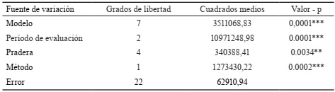En la tabla 1 se muestran los resultados del análisis de varianza. Hubo diferencias significativas (p < 0,05) entre las variables (período de evaluación, pradera y método usado).