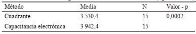 La comparación múltiple con un alfa del 5 % indicó que hubo diferencias significativas entre las mediciones con la aplicación del método de capacitancia electrónica y las obtenidas por el método del cuadrante. Serrano et al. (2016) manifestaron que el método de capacitancia es crucial en la evaluación de la masa de los pastos, debido a que se obtienen datos confiables en los muestreos. La disponibilidad de MS por el método tradicional fue de 3 530,3 kg de MS/ha, y por el de capacitancia electrónica de 3 942,4 kg de MS/ha (tabla 2). Esto demostró que entre los métodos de evaluación hubo diferencias significativas (p = 0,0002).
