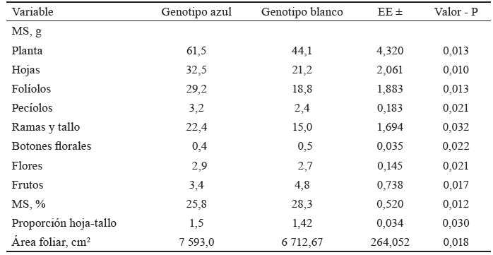 El genotipo de C. ternatea afectó significativamente (p < 0,05) el contenido de MS por planta y el de los componentes: hojas, folíolos, pecíolos, ramas y tallo, botones florales, flores y frutos. De igual manera, influyó en la proporción hoja/tallo y en el área foliar (tabla 1). En dichas variables, el genotipo azul registró los mayores valores, excepto para la MS de botones florales y frutos. Los valores de MS por planta y área foliar en este estudio superaron ampliamente los informados en otras investigaciones.