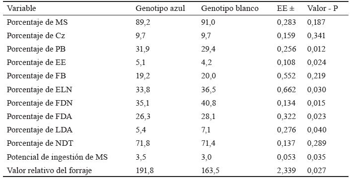 De acuerdo con los estándares de calidad para forrajes, descritos por Linn y Martín (1989), el porcentaje de FDN en el genotipo azul se ubicó en la categoría menor de 40 % (calidad excelente) y la del genotipo blanco, entre 40 y 46 % (calidad alta).
