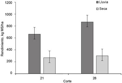 El rendimiento de forraje en la época de máximas precipitaciones superó (p < 0,05) en 63,1 % al obtenido en la época de mínimas precipitaciones, lo que coincide con lo informado por Cajas-Girón et al. (2012) en Megathyrsus sp. para la región Caribe. Asimismo, se observó que a los 21 días de rebrote la producción de masa de forraje fue menor en 20,7 % a la registrada a los 28 días (tabla 2). La interacción época ´ edad corte afectó (p < 0,05) el rendimiento de MS, con mayores producciones (kg de MS/ha) durante el período de lluvia a los 28 días de rebrote (fig. 1).