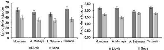 Con respecto al ancho y largo de la hoja, el análisis mostró efectos significativos para los factores cultivar, edad, época y la interacción época ´ cultivar. El mayor ancho y largo de la hoja (p < 0,05) se registró en el cv. Tanzania durante la época de máximas precipitaciones (fig. 2). A pesar de que los cultivares promisorios Agrosavia Mishaya y Agrosavia Sabanera presentaron el menor crecimiento de las hojas con respecto a los cultivares comerciales, estos mostraron un rendimiento similar de forraje que los testigos.