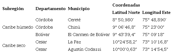 Localización y características del clima. El estudio se llevó a cabo en cinco localidades ubicadas en las subregiones Caribe húmedo y Caribe seco de Colombia (tabla 1). La subregión Caribe seco presenta zonas agrofísicas de planicie y mayor presencia de sabanas ácidas/salino sódicas, con ausencia de colinas en comparación con el Caribe húmedo; la precipitación anual promedio es de 1 561 mm, temperatura promedio de 29 ºC y humedad relativa de 68 %. La subregión Caribe húmedo se caracteriza por suelos de mediana a baja fertilidad y relieve ligeramente ondulado, precipitación promedio de 1 334 mm/año, temperatura promedio de 28 ºC y humedad relativa de 85 % (Mejía-Kerguelen et al., 2020; Roncallo-Fandiño et al., 2020).