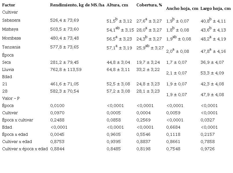 Agrosavia Sabanera, Agrosavia Mishaya, Mombasa y Tanzania presentaron rendimientos similares de MS (p > 0,05), sin efecto en las interacciones con la época y la edad de corte (p > 0,05). Los valores medios en los materiales evaluados variaron entre 480,4 y 577,8 kg de MS/ha (tabla 2).