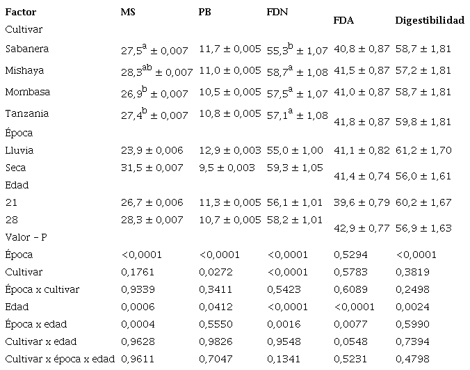 En las características nutricionales, el contenido de MS no difirió entre los cultivares (tabla 3). Sin embargo, en esta misma variable influyó (p < 0,05) la interacción de la época y edad. Las mayores proporciones de MS se registraron durante la época de sequía, a los 28 días de rebrote. En cuanto a la composición nutricional, Agrosavia Sabanera y Agrosavia Mishaya presentaron las mayores concentraciones de PB, que difirieron (p < 0,05) de las registradas por los cultivares Mombasa y Tanzania (tabla 3). De igual forma, hubo efecto (p < 0,05) de la época y la edad en el contenido de PB.