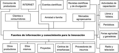 Fuentes de información y conocimientos que propician la innovación. Las fuentes de información y conocimiento en el contexto de la innovación agropecuaria pudieran definirse como los múltiples objetos, sujetos, productos y oportunidades que tienen los productores y los diversos actores de una cadena agroalimentaria para adquirir y transmitir conocimientos. Asimismo, la amplitud de este concepto abarca espacios físicos o virtuales, institutos de investigación (públicos y privados, nacionales o internacionales), universidades o instituciones especializadas en la difusión de tecnologías. En este enfoque, todos los actores son importantes, en mayor o menor medida, para difundir y aplicar el conocimiento (Antúnez-Saiz y Ferrer-Castañedo, 2021).