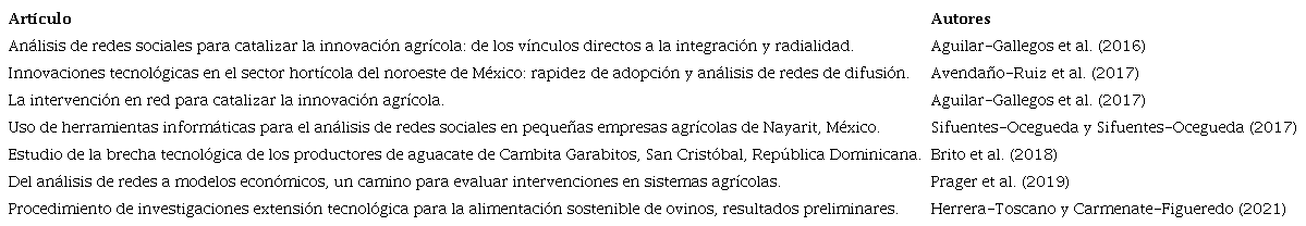 Redes sociales y su interacción con la innovación y la transferencia tecnológica. En la tabla 2 se muestran los principales resultados relacionados con las redes sociales y su interrelación con la innovación y la transferencia tecnológica obtenidos en América Latina y el Caribe. La mayoría de las investigaciones estuvieron enfocadas en investigar y potenciar la utilización del enfoque de redes sociales en los procesos de innovación agrícola.