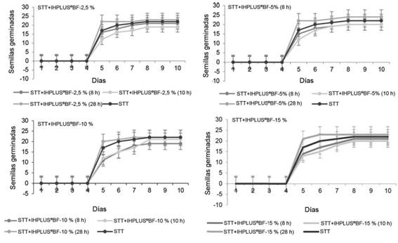 La cinética de germinación en cada uno de los tratamientos se muestra en la figura 1. En sentido general, se observó un comportamiento similar en todos los tratamientos. En cada dilución, el tiempo de imbibición a las 28 horas, fue el que mejor respuesta mostró.