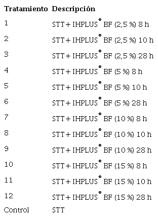 Tratamiento y diseño experimental. Para estudiar la respuesta germinativa de las semillas de L. leucocephala cv. Cunningham a la aplicación de diferentes diluciones y tiempos de imbibición (tabla 1), se realizó un experimento con un diseño completamente al azar, con arreglo factorial 3 x 4. Los tratamientos se conformaron por combinaciones de dos factores: a) tiempo de imbibición con tres tiempos diferentes (8, 10 y 28 horas) y b) diluciones de IHPLUS® BF, con cuatro diluciones (2,5; 5; 10; 15 mL L-1), y un control con semillas con escarificación térmica (agua a 80 ºC durante dos minutos).