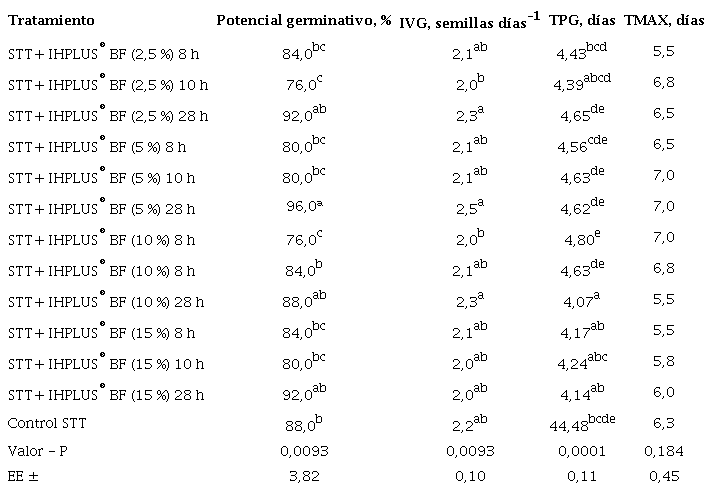 Todos los indicadores evaluados (índice de velocidad de germinación, índice de germinación, tiempo promedio de germinación y tiempo para alcanzar la máxima germinación) presentaron mejores valores en los tratamientos donde se utilizó el bioproducto con las cuatro dosis (2,5, 5, 10 y 15 %), embebidas durante 28 horas, sin diferencias significativas entre ellas. Hubo mayor eficiencia germinativa y transcurrieron seis días, como mínimo, para alcanzar la máxima germinación.
