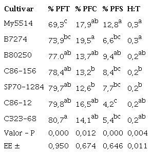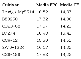 Los resultados del análisis de varianza para la variable PPC, que representa el contenido azúcar, y para la variable CF, mostraron que no hubo diferencias significativas entre los cultivares en estudio, por lo que todos mantuvieron el mismo patrón de comportamiento para ambas variables.