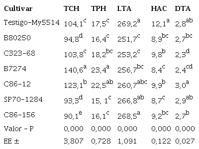 Las variables TCH y TPH, que representan el rendimiento agrícola y azúcar, respectivamente, y las variables longitud de los tallos, cantidad de hojas activas y el diámetro del tallo, mostraron diferencias significativas entre los cultivares para p ≤ 0,05 (tabla 2). Los cultivares B7274 y C86-12 superaron de manera significativa al testigo en las variables TCH y TPH. Los mejores resultados en las variables longitud y diámetro del tallo lo obtuvieron los cultivares C86-156, SP70-1284 y C86-12, sin diferencias significativas con el testigo My5514.
