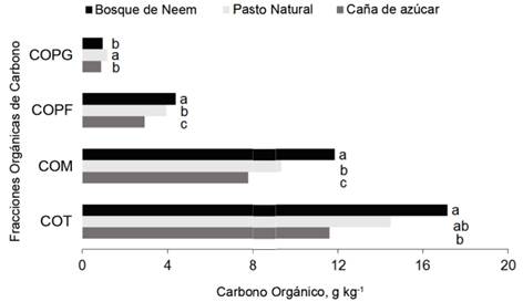 A medida que se incrementaron las prácticas de manejo, disminuyeron los contenidos de carbono orgánico total y sus fracciones. Se encontraron diferencias entre los tipos de uso de la tierra, siendo mayor en el bosque de A. indica. Le siguió el pasto natural y Saccharum spp. híbrido.