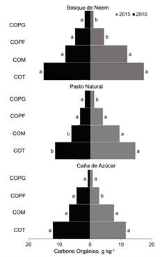 Results: There were significant differences in total organic carbon and its fractions in the different land uses and among them (p ≤ 0,05). In terms of total organic carbon, the A. indica forest was superior (16 and 32 %) to natural grass and hybrid Saccharum spp., respectively. This was due to the quantity and quality of plant biomass contributed by each crop and the increase in anthropogenic activity in the different land uses.