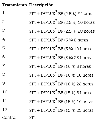 Tratamiento y diseño experimental. Los tratamientos (tabla1) se conformaron por la combinación de dos factores: A) tiempo de imbibición que se combinó con tres tiempos diferentes 8, 10 y 28 horas y B) diluciones de IHPLUS® BF, con cuatro diluciones (2,5; 5; 10 y 15 mL L-1) y un control: semillas con tratamiento térmico, escarificación térmica (agua a 80 ºC durante dos minutos). Se empleó un diseño completamente al azar con arreglo factorial y se utilizaron 10 repeticiones por tratamiento.