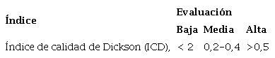 Análisis matemático. Para evaluar los atributos morfológicos de las plántulas de L. leucocephala, se utilizó la clasificación del índice de calidad de Dickson (ICD), referido por Sáenz-Reyes et al. (2014), cuya clasificación se describe en la tabla 2.