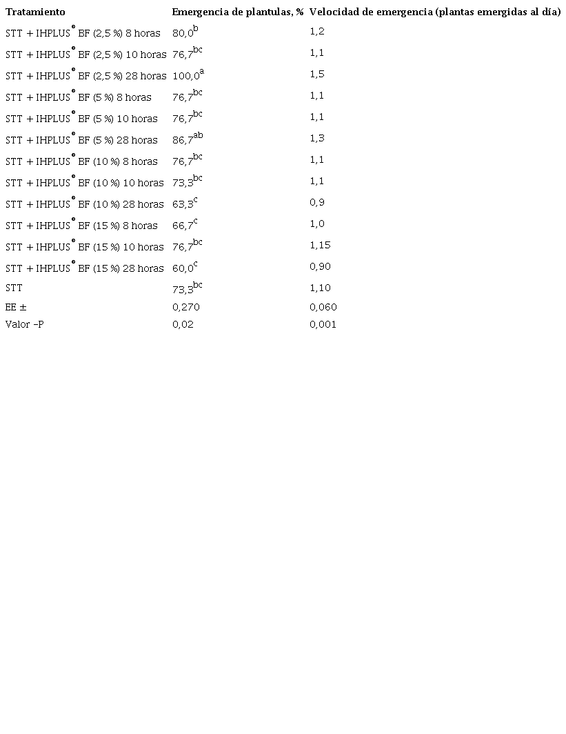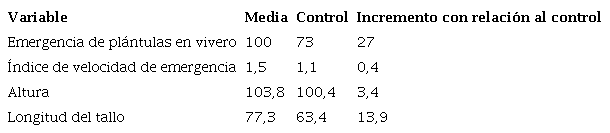 En sentido general, los resultados evidenciaron que el uso de microorganismos aislados de hábitats naturales, con capacidades para promover el crecimiento de las plantas, tiene una gran importancia y vigencia en la agricultura actual. En la tabla 6 se muestran los incrementos de cada uno de los indicadores con la combinación del método de escarificación térmica y el bioproducto IHPLUS® BF (2,5 %) durante 28 horas. Estos resultados demuestran su efectividad en la emergencia y el vigor de las plántulas, lo que resulta muy interesante por las grandes posibilidades que brinda para el establecimiento de esta planta.