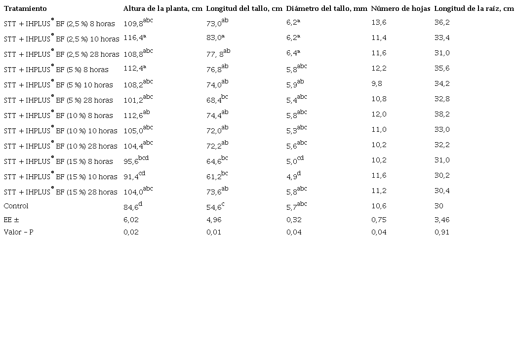 Los resultados demostraron que existieron diferencias significativas entre los tratamientos, en cuanto a altura de la planta, longitud del tallo y diámetro del tallo, siendo la combinación del método de escarificación térmica con el bioproducto IHPLUS® BF (2,5 %) el que presentó mejores resultados, con valores de 116,4 cm; 83,0 cm y 6,26 mm en la altura, longitud y diámetro del tallo, respectivamente. No se encontraron diferencias significativas para el número de hojas y la longitud de la raíz.