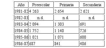 Asimismo, el crecimiento constante solo aparece para el nivel de preescolar, mientras que en primaria y secundaria se observan ciclos escolares con una tasa negativa. En el primer caso, en los periodos 1985-1986 y 1986-1987 las tasas fueron de -1.4 y de -2.5, respectivamente; respecto a la segunda, también en el ciclo 1984-1985 se presenta una tasa negativa, que llega a -14.5, cifra sorprendente si se toma en cuenta que uno de los programas apoyados durante el sexenio era la secundaria.
