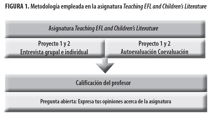 Para la asignatura Teaching EFL and Children’s Literature, como estrategia metodológica, se crean equipos de trabajo de no más de cinco estudiantes. Cada integrante asume una responsabilidad dentro del equipo: líder, secretario, asesor/es, monitor lingüístico. Intentamos que este último tenga mejor dominio de la lengua inglesa para garantizar el correcto uso de la misma durante las actividades. Se cuenta con una media de 30 a 35 alumnos por clase. Se trabaja con una amplia variedad de material literario para la enseñanza del inglés en preescolar y 1° de primaria. El estudiantado analiza el material y realiza adaptaciones en el nivel lingüístico. Se aplican técnicas de enseñanza basadas en la secuencia didáctica: pre-teaching/actual teaching/post-teaching.