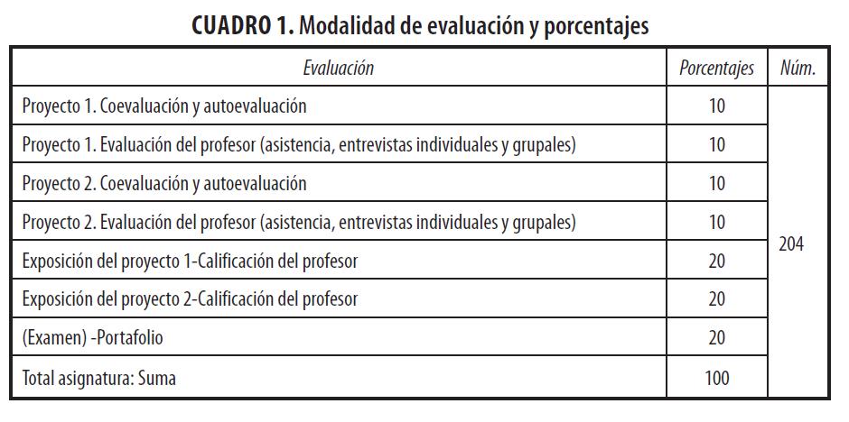 De tal manera, solo nos centraremos para el proyecto 1 en autoevaluación y coevaluación, y autoevaluación y evaluación del profesor (asistencia, entrevistas individuales y grupales), y para el proyecto 2, en autoevaluación y coevaluación, y evaluación del profesor (asistencia, entrevistas individuales y grupales). De esta manera, tanto alumnos como profesor siguen los mismos criterios de evaluación y la misma carga porcentual en cada caso.