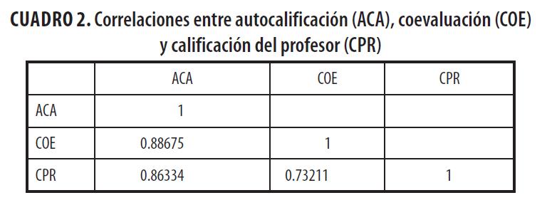 Como se ha señalado en el apartado de metodología, existen correlaciones entre los valores asignados a la autocalificación de alumnado (ACA), la coevaluación (COE) y la calificación del profesor (CPR). El coeficiente de correlación de Spearman para una muestra de N= 204 y un P > 0.000. El cuadro 2 recoge los resultados obtenidos.
