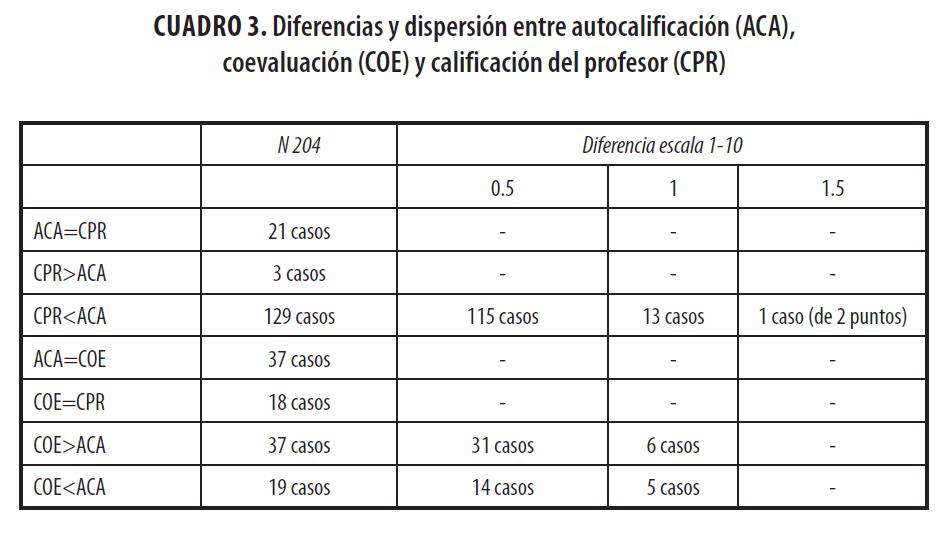 Se observa una correlación alta entre COE y ACA (0.88675) que nos indica la existencia de un acuerdo entre la participación y los aportes individuales al equipo, así como las valoraciones entre sus miembros. También se dan coeficientes de correlación altos entre CPR y ACA (0.86334) y CPR y COE (0.73211). Podemos inferir que las autocalificaciones y las calificaciones entre pares (coevaluación) y las del profesor son bastante confiables. Un segundo nivel de análisis profundiza sobre estos resultados. El cuadro 3 recoge las diferencias entre ACA, COE y CPR, el grado y la dispersión de las diferencias.
