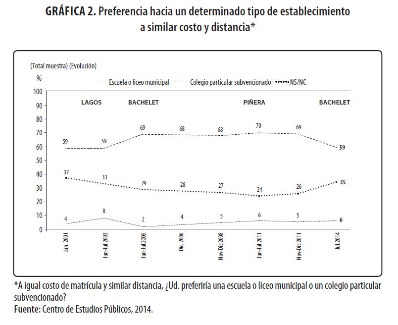 En el Estudio Nacional de Opinión Pública CEP (Centro de Estudios Públicos) de 2014,4 en el módulo educación, casi 60% de los encuestados prefiere poner a sus hijos en un colegio particular subvencionado (Gráfica 2). Este dato, sumado al anterior corroboran la tesis de que –a no ser que el establecimiento particular subvencionado cobre un co-pago superior a los 50 mil pesos– lo que finalmente eligen las familias es la “distinción social”, es decir, escapar de la mezcla de sus hijos con los hijos de familias provenientes de estratos más vulnerables, tal como lo explicita una apoderada entrevistada por un diario quien señala que “No me gusta esta reforma, porque todos los niños van a estar mezclados”.5 Esto se corresponde con lo que muestran los datos de la encuesta CIDE a actores del sistema educativo, donde se constata que a pesar de que los resultados no mejoran, los apoderados prefieren hacer un co-pago a las escuelas de sus hijos (Corvalán, 2003).