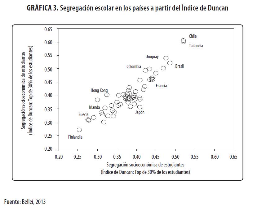 Los datos permiten no solo comprobar la composición socioeconómica de los establecimientos públicos, sino también su rendimiento en las pruebas estandarizadas. En la gráfica 3 se muestra cómo Chile posee el mayor índice de DUNCAN,7 el cual mide el grado de segregación socioeconómica (0 indica que no existe segregación y 1 es la existencia plena de segregación) entre 57 países. Es importante constatar que este ha aumentado en el tiempo entre 30% de alumnos de nivel socioeconómico superior y 30% de alumnos de nivel socioeconómico inferior (Bellei, 2013).