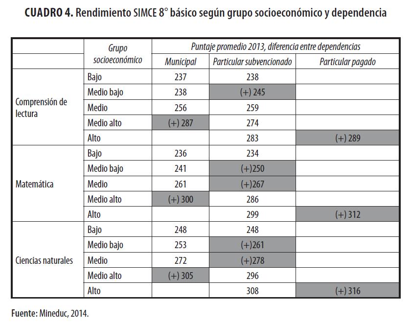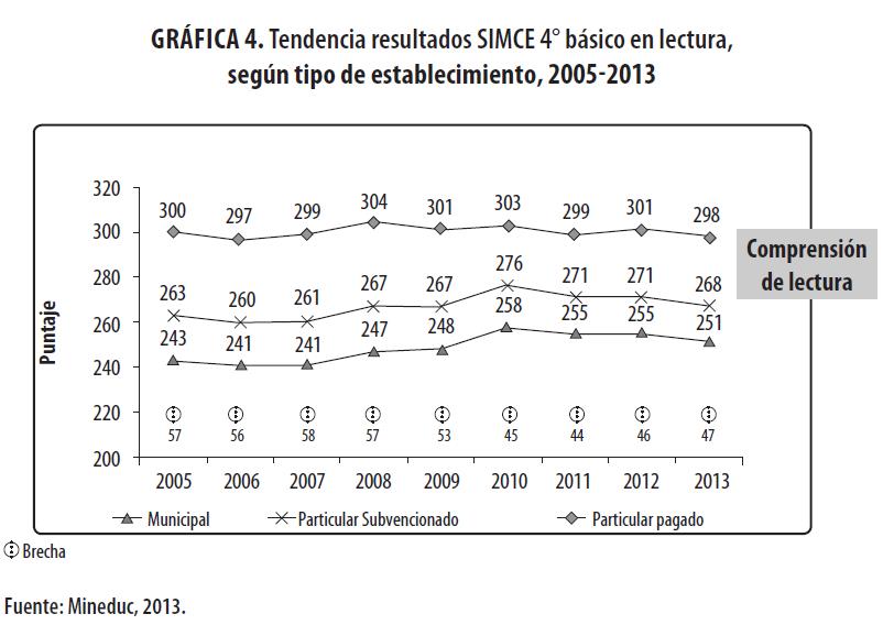 En la siguiente gráfica se puede observar el comportamiento de los puntajes SIMCE promedio por dependencia en 4° básico y en Lectura. Si bien la brecha entre el sector particular pagado y el municipal ha disminuido en 10 puntos entre 2005 y 2013, no deja de llamar la atención la estratificación que se mantiene estable con los años.