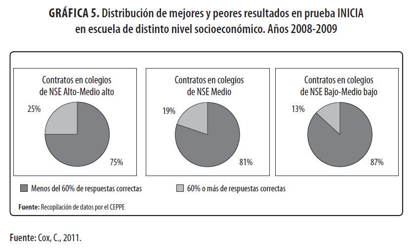 Según los datos del CEPPE presentados por Cox (2011), “los profesores de más bajo rendimiento en las pruebas INICIA se insertan en mayor proporción en las escuelas de nivel socioeconómico bajo o medio bajo (escala SIMCE)” (Cox, 2011: 5). En los establecimientos educacionales de niveles socioeconómicos alto-medio alto, 25% de los docentes responde más de 60% de respuestas correctas; en cambio, en los colegios de niveles socioeconómicos bajos el porcentaje de docentes con más de 60% de respuestas correctas solo es de 13%.
