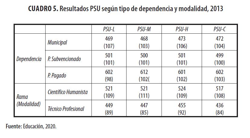 Lo mismo ocurre en la Prueba de Selección Universitaria, que selecciona a los alumnos por medio de un puntaje para determinar su ingreso a determinadas instituciones de educación superior y a las carreras, finalmente, termina siendo una representación de las desigualdades sociales y de la segregación del sistema educativo (cuadro 5). Pero en un nivel más profundo, al ser el mecanismo que permite el ingreso a la educación superior y, por ende, al mundo laboral, se reproducen las desigualdades sociales (Kremerman, 2007; OECD, 2009).