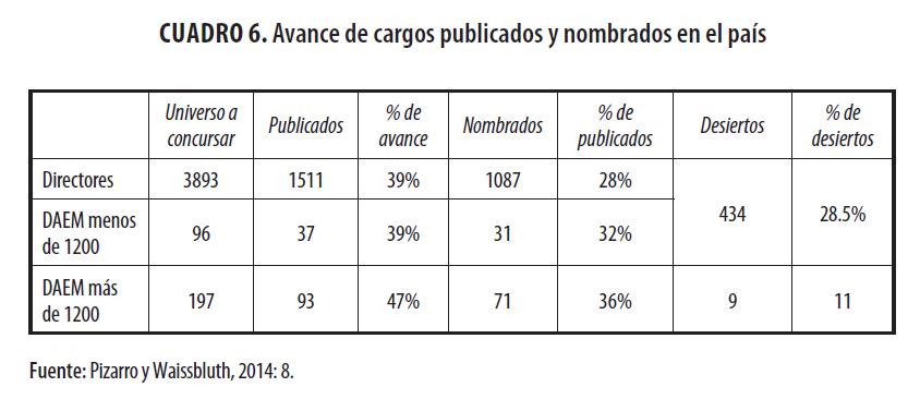 Hasta el 2005, en la educación pública existían muy bajos criterios de selectividad para los directores de escuela, lo que implicó en muchos casos que personas asumían el cargo de director gracias a sus relaciones políticas más que a criterios técnicospedagógicos; además, durante la dictadura militar, los directores adquirían la condición de vitalicios. Si bien en 1991 se establecen los primeros concursos para la elección de directores y jefes de las Direcciones de Administración de Educación Municipal (DAEM), esto no afectó a los vitalicios y la iniciativa no fue regulada por ley. En el año 2005, se dicta la ley N° 20.006, la cual establece la concursabilidad para todos los cargos de directores (incluyendo los vitalicios) y la gradualidad de su nombramiento, manteniendo el cargo con un plazo máximo de cinco años. Ya en 2011, se comienza a considerar la selección como un proceso técnico en el cual participa y apoya el “Concejo de Alta Dirección Pública”,9 además se establece un convenio de desempeño y se modifican las remuneraciones (Ley N° 20.501). Los logros de esta nueva ley son relevantes (como lo señala el cuadro 6) pero aún se requiere seguir fomentando la concursabilidad para los cargos de directores de establecimiento y jefes DAEM.
