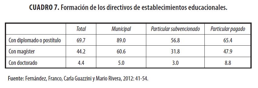 Un dato interesante es el hecho que 99% de los directores para 2010 declaraba tener al menos un título profesional relacionado con educación, incluso existiendo altos porcentajes de directores con postgrados (cuadro 7). Ahora bien, aunque opera una distribución desigual de los títulos, en este caso es en favor de los directivos municipales, debido a que este sector es el que posee un mayor porcentaje de directivos con postítulos y directores con grado de magister (solo cuando se habla de doctorado la educación pública cuenta con directores menos formados en relación con los directores de establecimientos particulares subvencionados). Si los resultados del rendimiento de los directores no son los óptimos, entonces cabe preguntarse por la formación inicial y continua que poseen los directores, y la acreditación de esta (capacitaciones, postgrados, etcétera).
