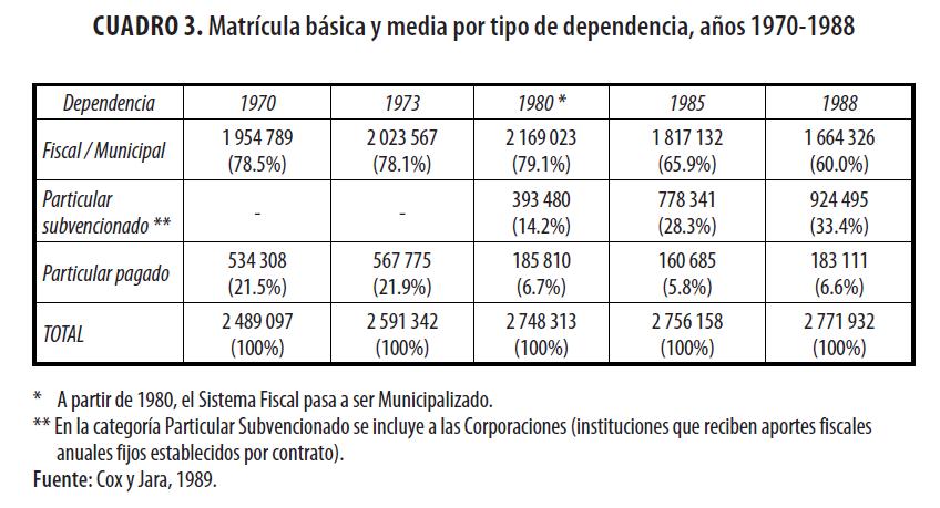 Como podemos observar, en Chile se cumplía cabalmente el principio de libertad de enseñanza, fundamentalmente por el poder de las élites gobernantes y la influencia y el poder histórico de la iglesia católica (pugna encargada entre los partidos conservador y liberal). Esta fórmula de provisión mixta funcionó bastante bien hasta la década de los ochenta, cuando surgieron los primeros cuestionamientos de jóvenes liberales.
