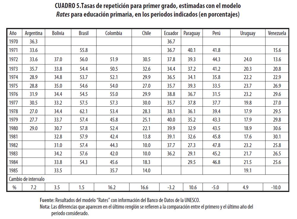 Para América del Sur se ha estimado una tasa de reprobación de 47.5%, recurriendo a modelos de simulación capaces de computar las tasas mínimas de repetición que resultan consistentes con el flujo de cada cohorte de alumnos por los diversos grados del sistema (Schiefelbein, 1989: 19). Los resultados de los modelos de simulación fueron puestos a prueba en dos estudios de campo (Cuadra y Ewert, 1987 y Wynn Crowder, 1988) y en dos de seguimiento de cohortes por edades (Alonso, 1988 y Schiefelbein, 1989). Las tasas estimadas de reprobación para el primer grado se muestran en el cuadro 5. Se observa una lenta reducción de las tasas de repetición en seis países, mientras que en dos de ellos se aprecian aumentos y en los dos restantes permanecen constantes a lo largo del periodo. El problema de la repetición requiere de algún tipo de atención permanente, o de lo contrario las tasas comienzan a crecer de nuevo, como en el caso de Chile (entre 1983 y 1985) y Uruguay (de 1981 a 1984).