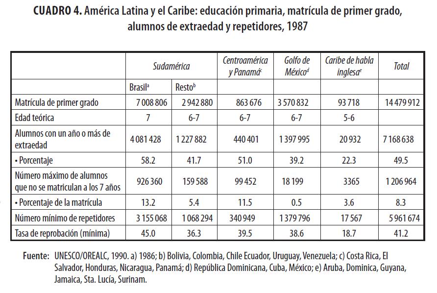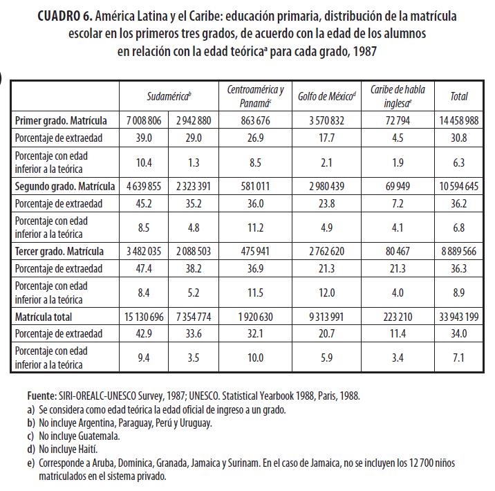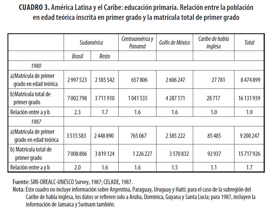 A pesar del ingreso oportuno, todavía se matriculan en el primer grado de la escuela primaria demasiados alumnos con edades superiores a la teórica, y la mayoría de ellos son repetidores (véase cuadro 3). De hecho, en el periodo 1980-1987 cerca de dos cohortes por edad se matricularon en primer grado. Esta es otra manera de mirar el mismo problema: la mayoría de los niños (todos, en muchos países) se encuentran matriculados, pero permanecen demasiado tiempo en los primeros grados (alrededor de la mitad de los niños pasa dos años en el primer grado).