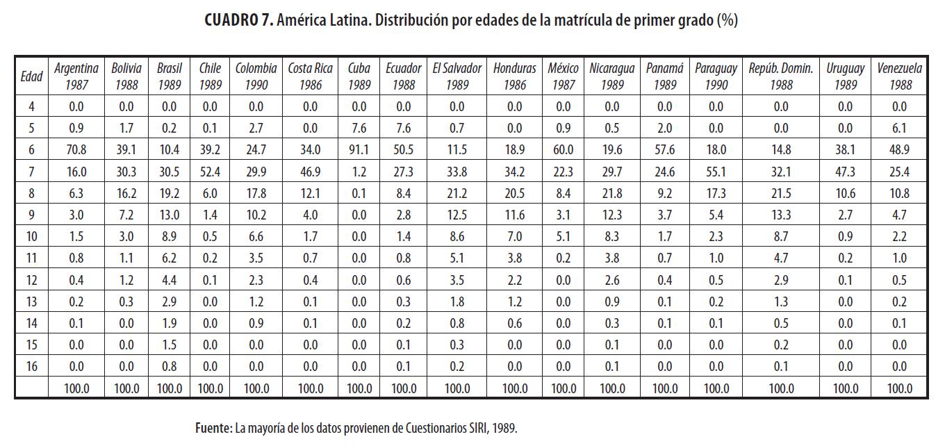 El ingreso oportuno también ha mejorado, y actualmente la entrada tardía en una cohorte latinoamericana no excede 10% (véase cuadro 1). En una cohorte de edad típica, la mitad de los niños ingresa a la escuela a los siete años. Un tercio se matricula por vez primera un año después. A lo más, alrededor de 10% ingresa al sistema con retraso, a la edad de 8 o 9 años. La gran heterogeneidad de edades en las aulas latinoamericanas se debe a la reprobación, no al ingreso tardío (OREALC-UNESCO, 1989).