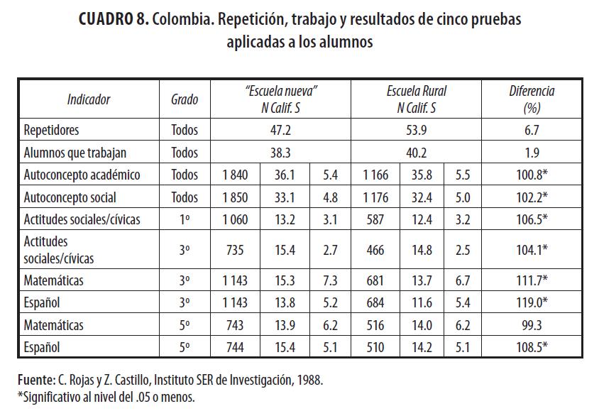 Rojas, C. y Z. Castillo, Evaluación del programa Escuela Nueva en Colombia, Bogotá, Instituto SER de Investigaciones, 1988.