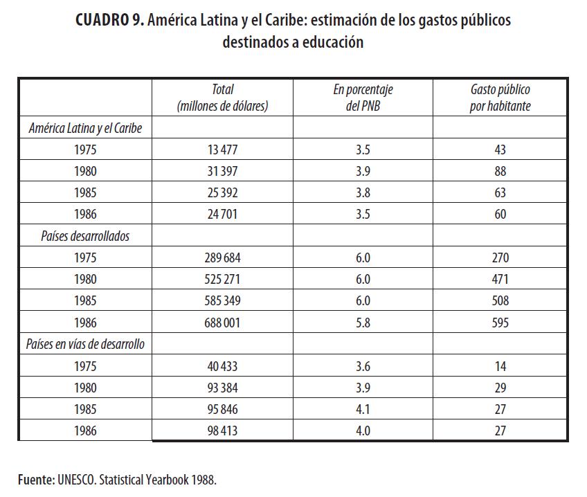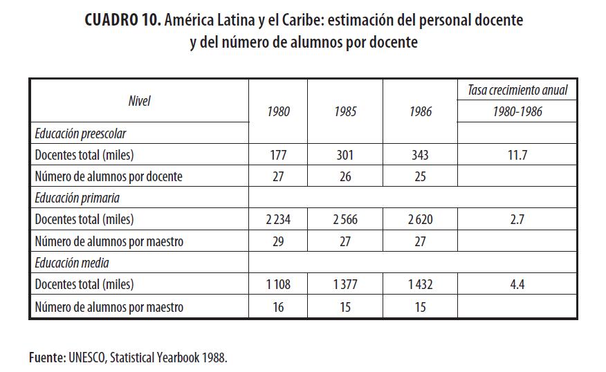 UNESCO/OREALC. Situación Educativa de América Latina y el Caribe, 1980-1987, Santiago, Chile, 1990.