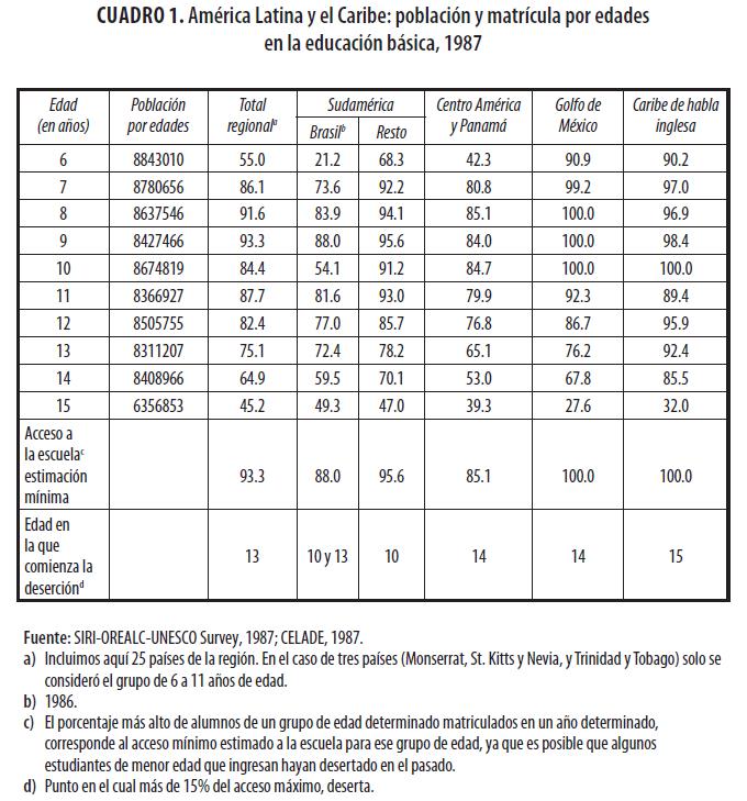 Resulta sorprendente observar que en América Latina 93.3% de los niños de 9 años de edad se encontraba matriculado en la escuela en 1987 (véase cuadro 1). Puede suponerse que más de 95% de esa cohorte haya estado o vaya a estar en la escuela en algún momento de su vida, ya que se estima que entre 2 y 3% de ese grupo de edad se matricula más tarde o deserta después de haberse matriculado entre los 6 y los 8 años. El saldo (de 4 a 5%) corresponde a niños que requieren atención especial o que viven en comunidades muy pequeñas y aisladas, y se concentra en cuatro países de América Latina (o en regiones dentro de esos países). Por tanto, puede decirse que el sistema educativo proporciona lugar a todos los niños que demandan escuelas convencionales. Hay suficientes maestros y suficiente cupo en las aulas, aunque ambos pueden ser mejorados (tanto en número como en calidad).