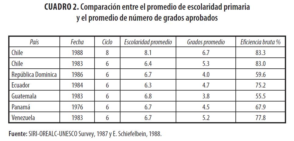 Aunque actualmente hay acceso para todos, también existen enormes diferencias en los resultados, los cuales deberán reducirse en el futuro si lo que se persigue es un sistema educativo más democrático. Solo se aprueban alrededor de cinco grados (en los sistemas educativos con seis grados de educación primaria), después de permanecer en la escuela durante seis o siete años. Por tanto, los grados aprobados representan solo dos terceras partes del tiempo de permanencia en la escuela (véase cuadro 2). Existe evidencia fragmentaria que sugiere que la mayor parte de los alumnos de las clases medias y altas egresan de la escuela primaria; por tanto, los alumnos de educación primaria de la mitad inferior de la distribución socioeconómica, aprueban menos de cuatro grados.3 La diferencia entre la escolaridad y los grados aprobados corresponde al fracaso en el logro de los niveles esperados de calidad. La gran diferencia que existe entre los distintos grupos socioeconómicos en América Latina es un primer indicador de la inequidad y de la baja calidad de la educación proporcionada por las escuelas públicas y del desperdicio de los fondos públicos debido a la repetición.