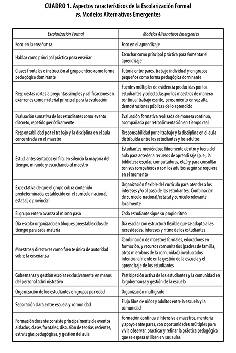 A grandes rasgos, las revisiones de experiencias de reforma a lo largo del mundo llegan a conclusiones similares: Las propuestas de reforma educativa pocas veces se ejecutan. Si llegan a hacerlo (ya por la vía legislativa, por medio de reglas, ya por programas experimentales), pocas veces se implementan bien y a gran escala o tienden a diluirse tras pocos años, mientras que el sistema vuelve lentamente a su estado normal. En los pocos casos en que se hace bien, a gran escala y de manera sostenible, hay muy poca evidencia del impacto a largo plazo y a escala, en la misión básica del proyecto que llamamos escuela: posibilitar y mejorar la capacidad de los niños y jóvenes de aprender con profundidad. Lo que se sabe acerca el aprendizaje humano no tiene prácticamente nada que ver con el modo en que continúan operando las escuelas. Las formas de escolarización formal, establecidas en el siglo XIX, reflejan las concepciones erróneas sobre el aprendizaje humano de las élites intelectuales, políticas y económicas de aquella época, fundamentalmente distinta de la actual. Pero ahora que están tan bien establecidas, es muy difícil cambiarlas, al menos en gran escala (Ver Elmore, 1996). El cuadro 1 esboza algunos de los aspectos distintivos de la escolarización formal, yuxtapuestos con los modelos alternativos de educación que se presentan más adelante en este trabajo.