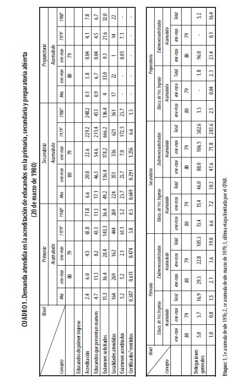 Otro aspecto muy importante de la educación de los adultos lo constituye la primaria, la secundaria y la preparatoria abierta; el cuadro 1 presenta los datos básicos para estas modalidades.