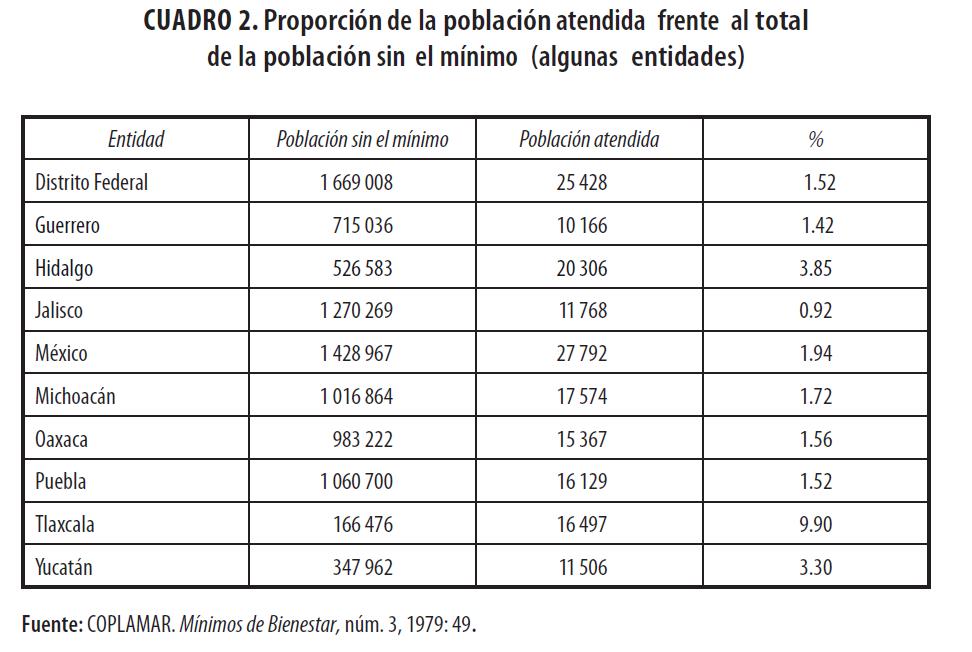 Por último, uno de los principales problemas que se debatían en el contexto 1976-1981 era la baja productividad del sistema. Conforme a los datos, la atención de la alfabetización tiene una tasa de crecimiento negativa de -21.3% anual entre 1978-1980. En cambio, la primaria de adultos tuvo un incremento sustancial (81.3% anual). El total de la población atendida se incrementó a una tasa de 20.8% de promedio anual. Pese a esto, en términos absolutos, el crecimiento no fue tan significativo frente a la magnitud del rezago (COPLAMAR,1982: 39). Véase, por ejemplo, en el cuadro 2, la proporción de población atendida frente al total de la población sin el mínimo en algunas entidades.