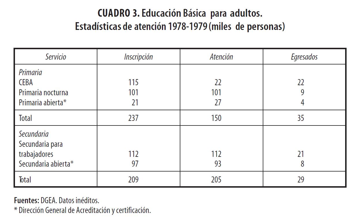 Entre los servicios más importantes se cuentan los Centros de Educación Básica para Adultos (CEBA), los que desarrollan actividades de introducción a la primaria –alfabetización– y de primaria intensiva. Se localizan fundamentalmente en áreas urbanas y se rigen por el calendario oficial. En 1980 existían 983 CEBA que atendían a una población total de 99 903 adultos. En el ciclo escolar 1978-1979 acreditaron 24 625 alumnos.