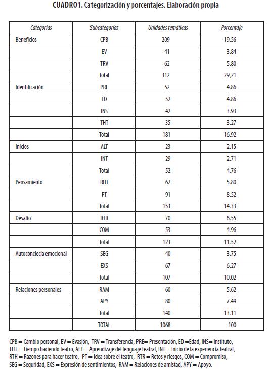 Para cuantificar las unidades temáticas referidas a la identidad y a la autonomía hubiera sido necesario haber establecido dos subcategorías más en Beneficios. De este modo hubiéramos podido comprobar el peso de estas dimensiones en la relación entre actividades teatrales y desarrollo positivo.